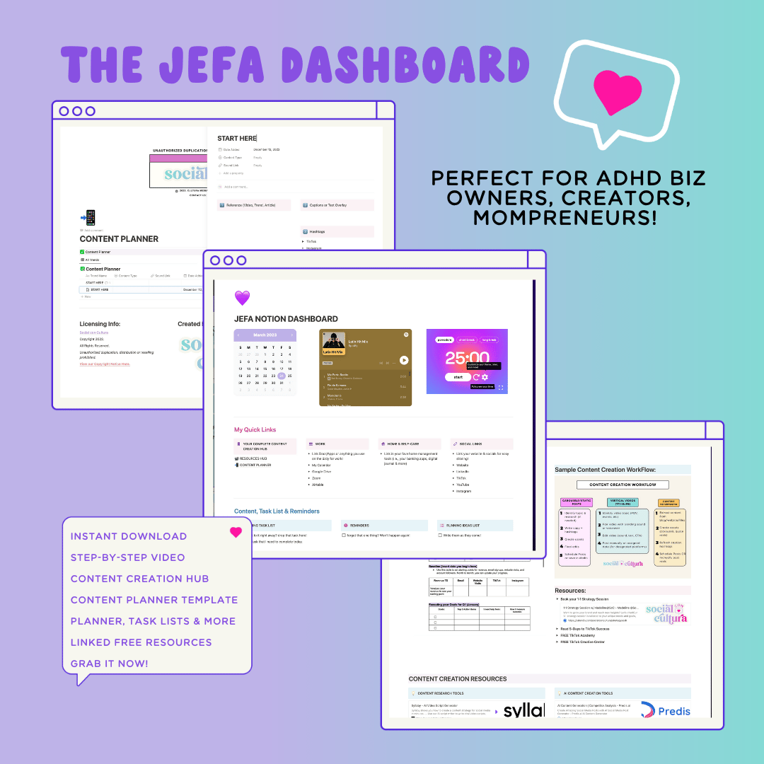 The Jefa Notion Dashboard and content planner - the perfect tool for small businesses and creatives. It helps you organize tasks, track projects, and plan content all in one place. Made Especially for Jefas like you! BONUS: content resource hub for creating high-converting content fast!